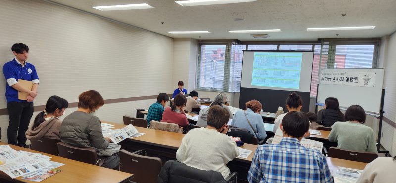 2/11(水)に開催された「北海道野付から母さん達がやって来る❣️「浜の母さん料理教室」」の様子です。ホタテの殻むきや鮭のちゃんちゃん焼きなど調理、試食を行いました。
